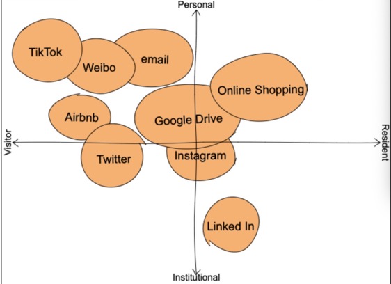 By reading the article “Residents and Visitors” I created my own digital media relationship VR map.